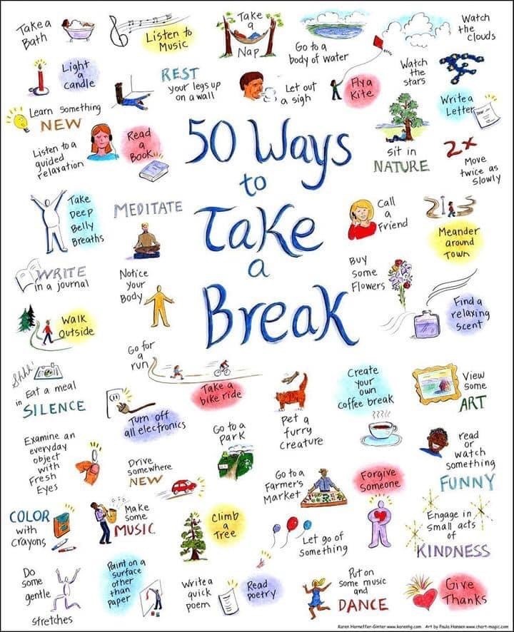 This weeks task for the children is a memory one - the year 6 children always speak about their favourite memory of their time at St Aidan's when they do their leavers assembly. This week I'd like to know everyones favourite memory/favourite thing about St Aidan's. I'm going to do a video message this week telling you what my favourite memories are. I've also attached a poster for 50 ways to take a break - they're not all posisble during lockdown but I wonder how many you have done in the last 14 weeks.